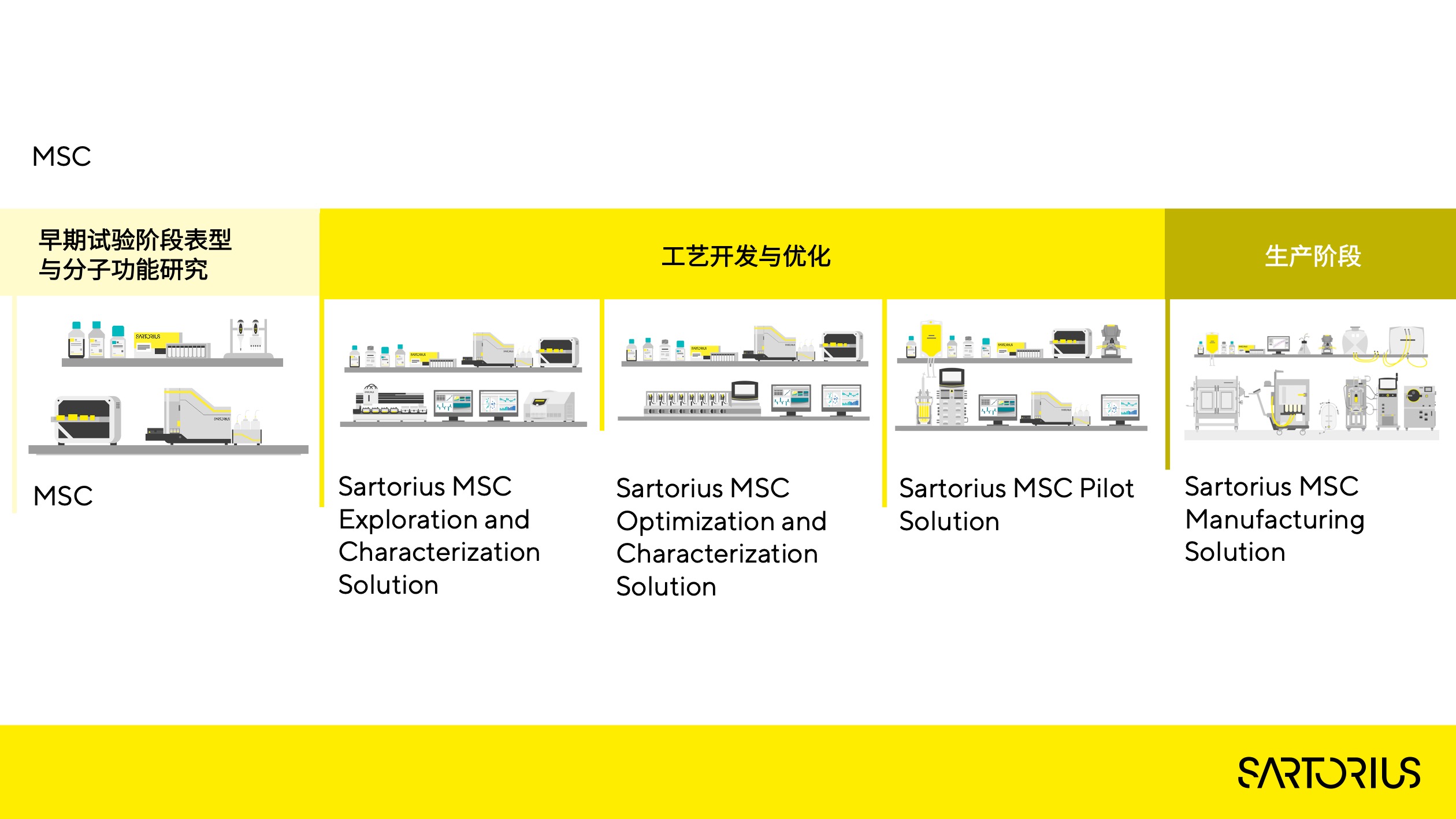 MSC的全工藝流程可以從實(shí)驗(yàn)室階段開始的早期分子靶點(diǎn)功能和表型表征研究,進(jìn)入到小試階段的工藝開發(fā)與優(yōu)化,最后進(jìn)入產(chǎn)業(yè)化生產(chǎn)階段。對(duì)于每一個(gè)階段的任務(wù),賽多利斯都有對(duì)應(yīng)的解決方案,加速M(fèi)SC產(chǎn)品的上市進(jìn)程。