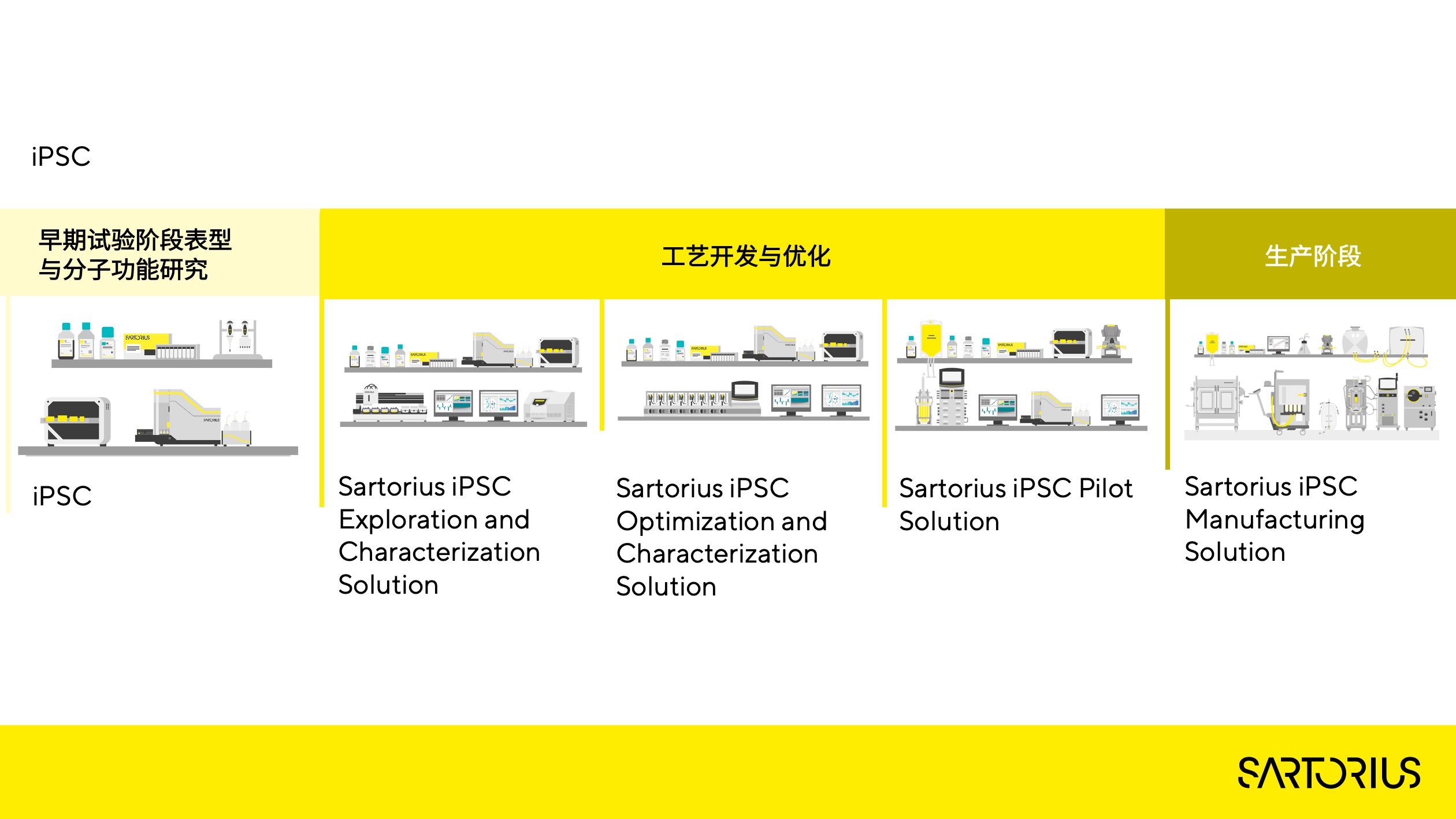 iPSC的全工藝流程可以從實(shí)驗(yàn)室階段開始的早期分子靶點(diǎn)功能和表型表征研究,進(jìn)入到小試階段的工藝開發(fā)與優(yōu)化,最后進(jìn)入產(chǎn)業(yè)化生產(chǎn)階段。對(duì)于每一個(gè)階段的任務(wù),賽多利斯都有對(duì)應(yīng)的解決方案,加速iPSC產(chǎn)品的上市進(jìn)程。